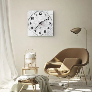 De klok is gemaakt van 4 mm dik gehard veiligheidsglas. De technologie van het maken van de klok voldoet aan de veiligheidsklasse 2B2 volgens de PN-EN 12600: 2004-norm, die weerstand tegen schokken garandeert. De klok op het glas is klaar om op te hangen - hij heeft een metalen hanger aan de achterkant van de klok en een schuimafstand die de even afstand tussen de klok en de muur regelt. De klok heeft een stil zwevend mechanisme dat wordt aangedreven door een batterij van 1,5 V - AA-batterij (batterij niet inbegrepen).
