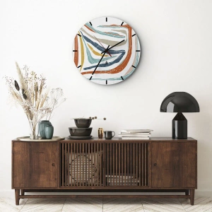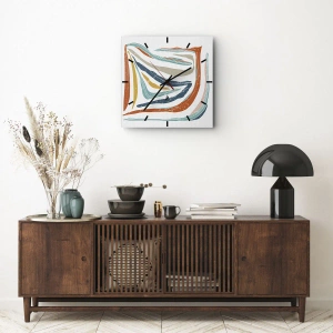 - Deze glazen wandklok van 30x30 cm heeft een dynamisch en kleurrijk abstract ontwerp dat doet denken aan golven en lijnen. Een decoratief element dat optimisme, lichtheid en een creatieve touch aan elk interieur geeft.