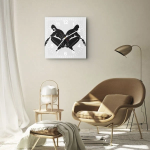 De klok is gemaakt van 4 mm dik gehard veiligheidsglas. De technologie van het maken van de klok voldoet aan de veiligheidsklasse 2B2 volgens de PN-EN 12600: 2004-norm, die weerstand tegen schokken garandeert. De klok op het glas is klaar om op te hangen - hij heeft een metalen hanger aan de achterkant van de klok en een schuimafstand die de even afstand tussen de klok en de muur regelt. De klok heeft een stil zwevend mechanisme dat wordt aangedreven door een batterij van 1,5 V - AA-batterij (batterij niet inbegrepen).