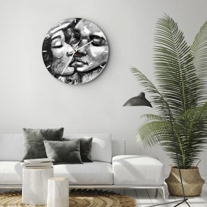 De wandklok "Tender Moment" is een unieke compositie gebaseerd op emoties en verbondenheid. Het toont een paar tijdens een intiem kussend moment, omhuld door een artistieke zwart-wit stijl. Expressieve lijnen en subtiele schaduwen creëren een expressief beeld dat de aandacht trekt en ontroert.