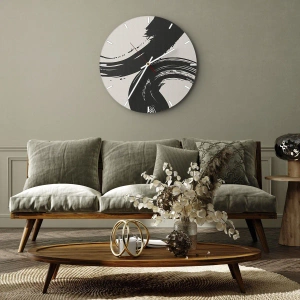 "Sweeping and Circular" is een uiterst expressieve wandklok, waarvan het hoofdthema gebaseerd is op expressieve penseelstreken. De zwarte compositie op een lichte achtergrond doet denken aan kalligrafie of Japanse inktschilderkunst.
