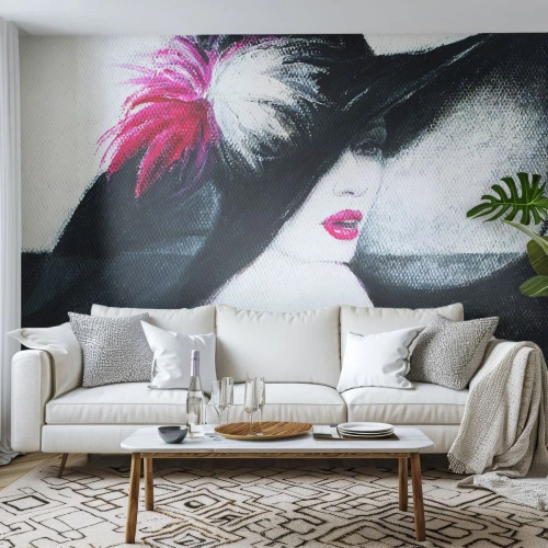 Zelfklevend Fotobehang Deluxe Sticker - Altijd een geheim - Vrouw In Een Hoed, Het gezicht van de vrouw, rode lippen - 200x140 cm