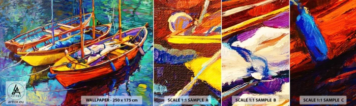 Fotobehang Staaltje Standard Eco - Op water vol met kleuren - Łódź, Zeilboot, Zee - 100x30 cm