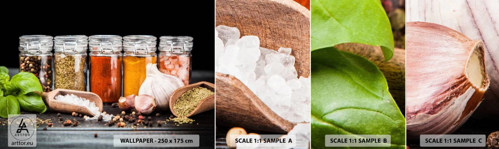 Fotobehang Staaltje Standard Eco - Zodat het leven smaak heeft - Gastronomie, Gedroogde kruiden, Specerijen - 100x30 cm