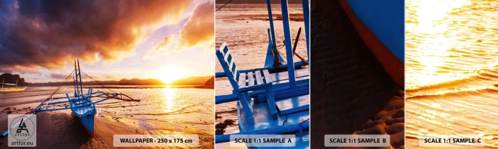 Fotobehang Staaltje Standard Eco - Strek je uit op het zand na een hele dag - Landschap, Zee, Vissersboot - 100x30 cm