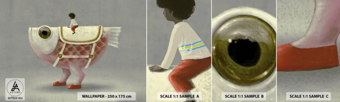 Fotobehang Staaltje Standard Eco - Ruiter op een surrealistische vis - Abstractie, Vis, Voor kinderen - 100x30 cm