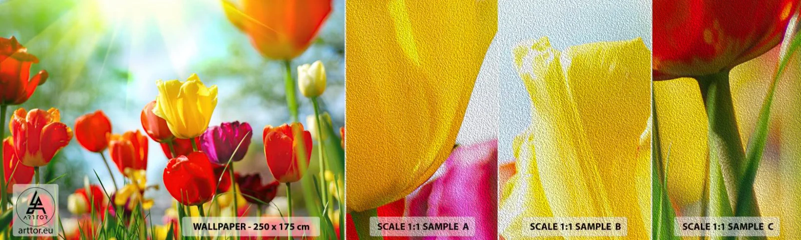 Fotobehang Monster Premium Sand - Alle kleuren van de zon - Tulpen, Bloemen, Wei - 100x30 cm