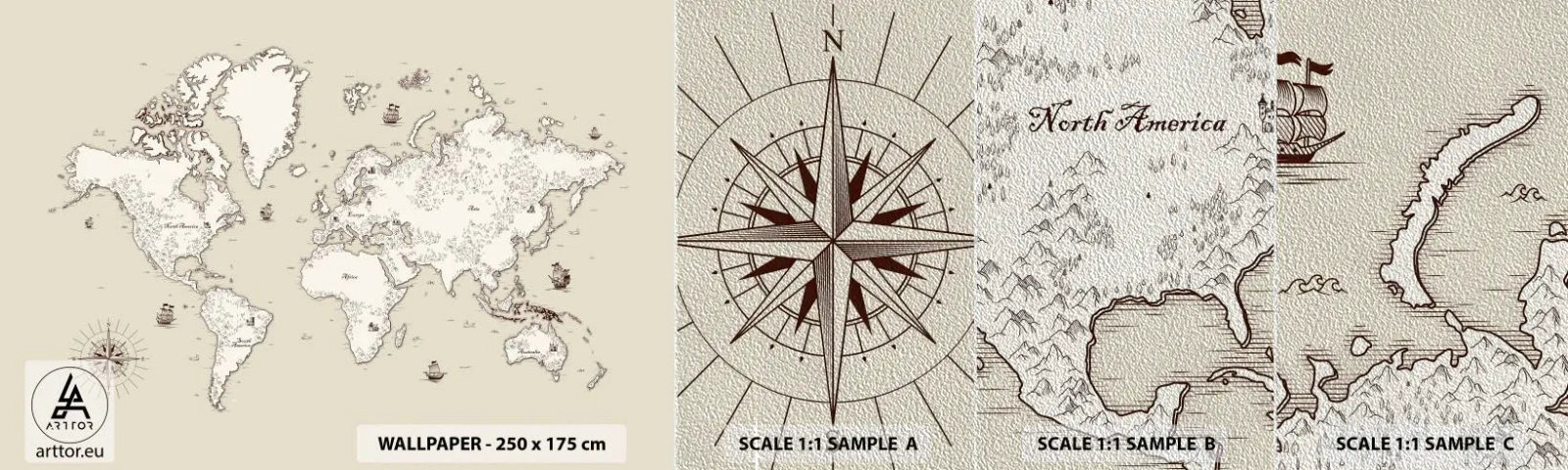 Fotobehang Monster Premium Sand - Reis rond de wereld - Wereldkaart, Continenten, Piratenschip - 100x30 cm