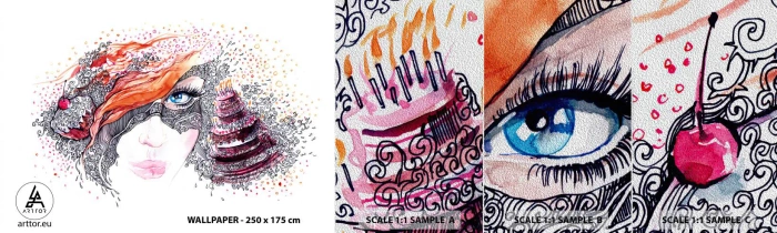 Fotobehang Monster Premium Sand - Elke dag is er een feestdag met haar - Abstractie, Het gezicht van de vrouw, Taart - 100x30 cm
