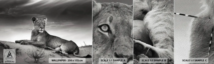 Fotobehang Monster Premium Sand - De koningin van de woestijn rust - Dieren, Leeuw, Woestijn - 100x30 cm