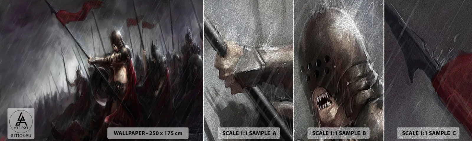 Fotobehang Monster Premium Sand - Voorbijganger, vertel Sparta... - Ridder in harnas, Leger, Abstractie - 100x30 cm