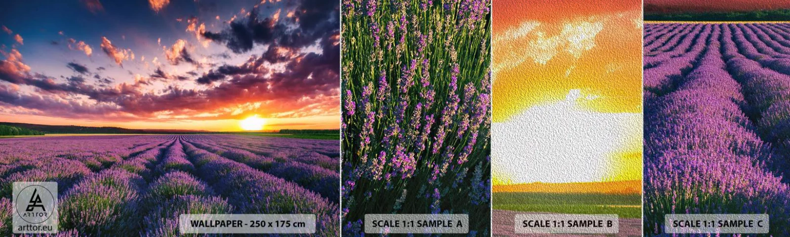 Fotobehang Monster Premium Sand - Lavendel wereld - Landschap, Lavendelveld, Lavendel - 100x30 cm
