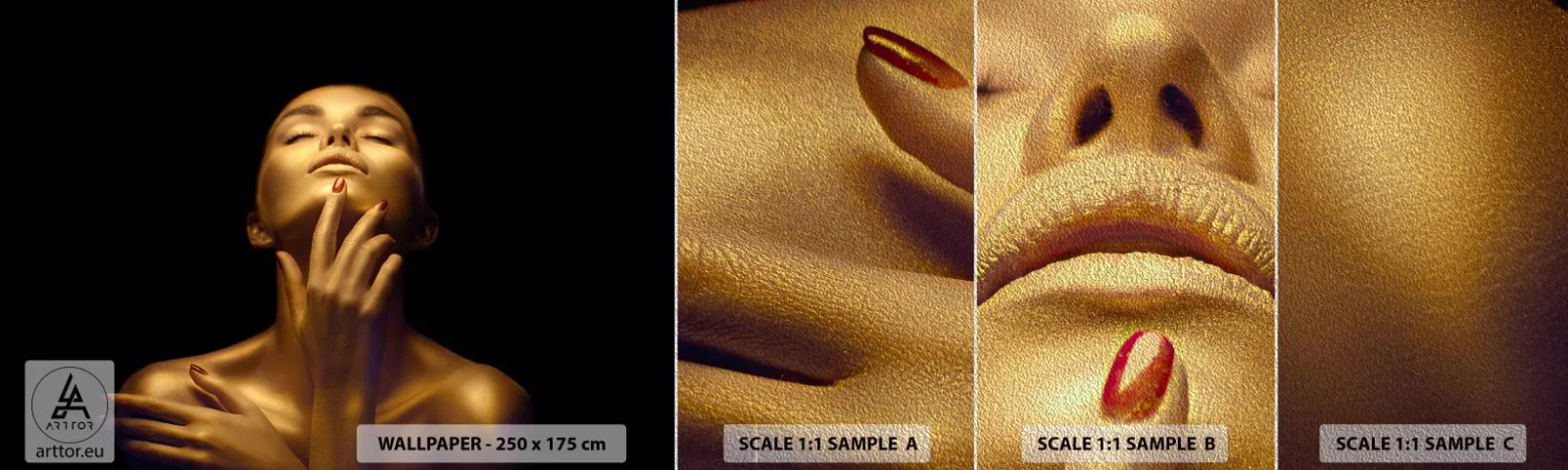 Fotobehang Monster Premium Sand - Als gouden zijde - Vrouw, Het gezicht van de vrouw, Lichaam - 100x30 cm