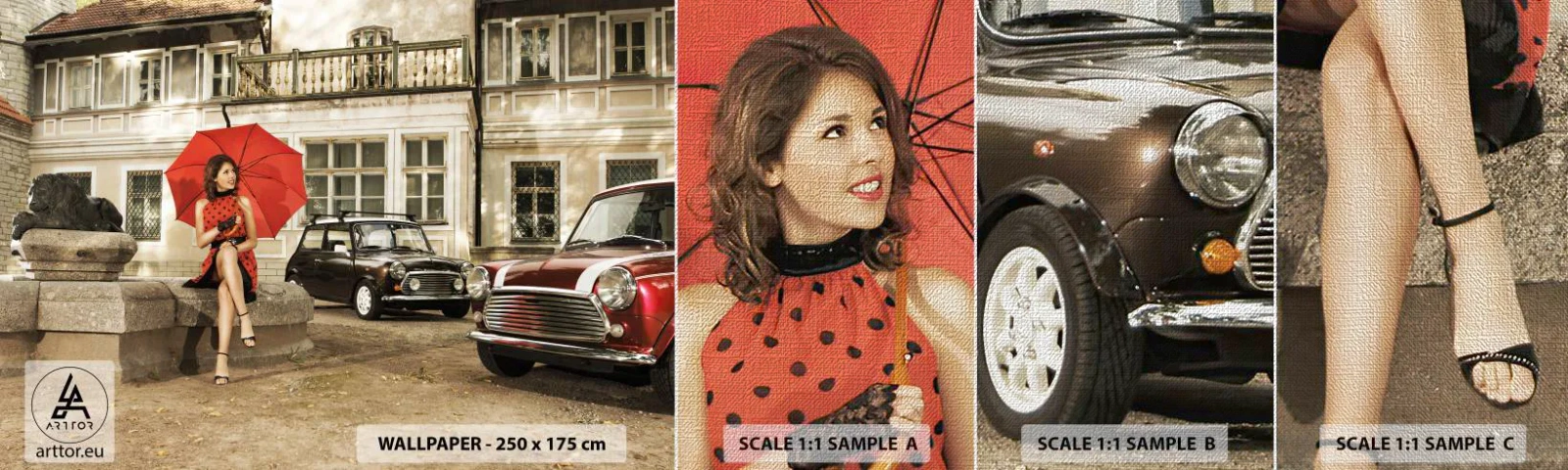 Fotobehang Monster Premium Canvas - Een sentimentele mini-reis - Vrouw, Architectuur, Auto - 100x30 cm