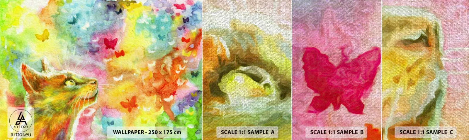 Fotobehang Monster Premium Canvas - Baju-baju in het kattenparadijs - Dieren, Kat, Vlinder - 100x30 cm