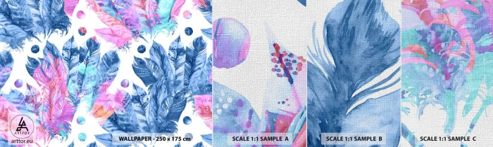 Fotobehang Monster Premium Canvas - Pluimen in roze en blauw - Vogelveer, Kleurrijke illustratie, Grafisch - 100x30 cm
