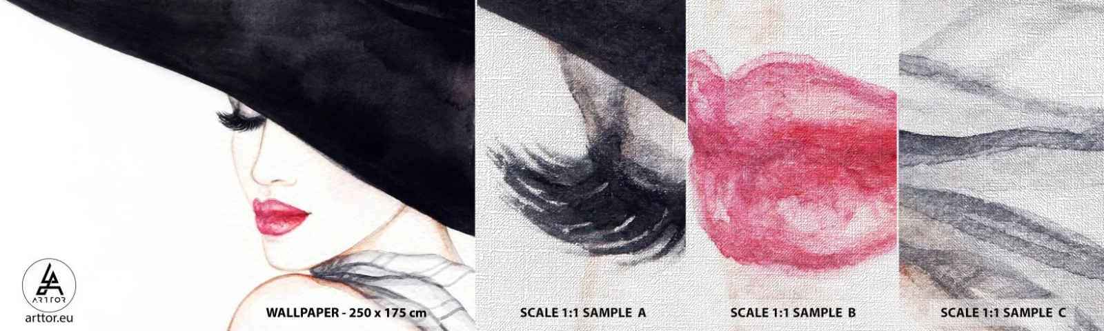 Fotobehang Monster Premium Canvas - Elegantie en sensualiteit - Vrouw, rode lippen, Zwarte hoed - 100x30 cm