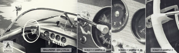 Fotobehang Monster Premium Canvas - Weer voor de rijken - Uitstekende boot, Motorboot, Zwart en wit - 100x30 cm