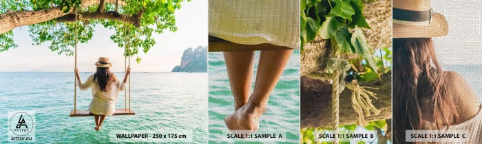 Fotobehang Monster Premium Canvas - Het leven is prachtig - Ontspanning, Schommel, Vrouw - 100x30 cm