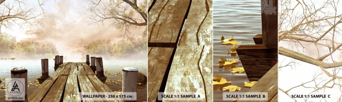 Fotobehang Monster Zelfklevend Deluxe Sticker - Het milde verdriet van de herfst - Landschap, Meer, Houten brug - 100x30 cm