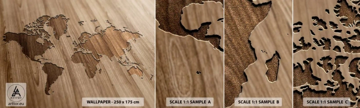 Fotobehang Monster Zelfklevend Deluxe Sticker - De wereld ligt op tafel - Wereldkaart, Hout, Continenten - 100x30 cm