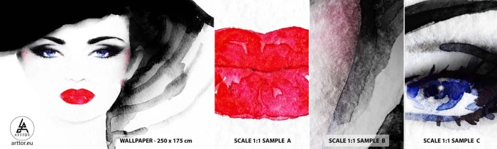 Fotobehang Monster Zelfklevend Deluxe Sticker - Hij duwt terug en roept - Het gezicht van de vrouw, rode lippen, Blauwe ogen - 100x30 cm
