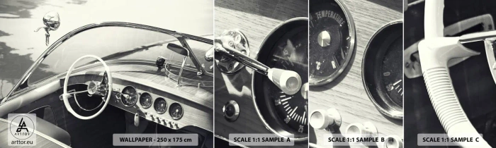 Fotobehang Monster Zelfklevend Deluxe Sticker - Weer voor de rijken - Uitstekende boot, Motorboot, Zwart en wit - 100x30 cm