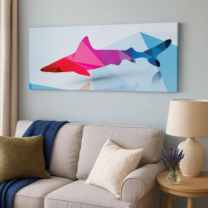 "Shark in a Crystalline Space" is een canvasprint van 70x50 cm die de aandacht trekt met zijn geometrische patroon en levendige kleuren. Het toont een haai, waarvan het silhouet, samengesteld uit abstracte vormen, een dynamische en moderne compositie creëert. De combinatie van roze en blauwe tinten geeft het geheel een frisse en energieke uitstraling.