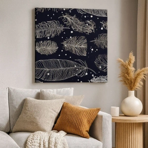 - Deze canvasprint toont delicate witte veren verspreid tegen een marineblauwe achtergrond. Een perfecte keuze voor wie van subtiele en elegante decoratieve motieven houdt.