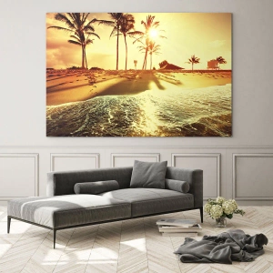 - Een goudkleurig strand met palmbomen bij zonsondergang, wat een sfeer van ontspanning en exotisme creëert. Een perfect glasschilderij dat elk interieur opfleurt.