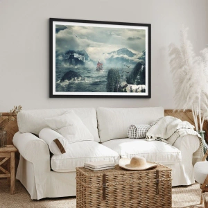 - De poster toont een schip op een stormachtige zee nabij een kasteel gehuld in mist. Het expressieve landschap, vol mysterie en drama, creëert een buitengewone sfeer. De zwarte lijst benadrukt de diepte van de afbeelding en geeft het interieur elegantie.