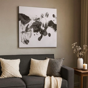 - Het schilderij toont een abstracte compositie van zwarte vlekken op een witte achtergrond, wat een opvallend contrast en evenwicht creëert tussen chaos en harmonie. Het past perfect bij moderne ruimtes en voegt een dynamische en artistieke toets toe.