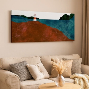 - Dit schilderij toont een vuurtoren tegen een achtergrond van majestueuze bergen en een kalme zee. Het is de perfecte decoratie en brengt harmonie en een natuurlijke sfeer in elk interieur.