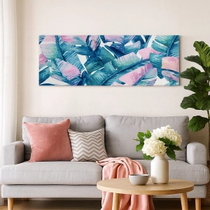 Schilderen op canvas - Bananenbladeren in tinten blauw en roze - 70x50cm - In een bananenboomgaard - Moderne wanddecoratie voor woonkamer en slaapkamer ARTTOR