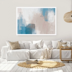 Poster - Roze abstractie achter een blauw gordijn - 40x30 cm