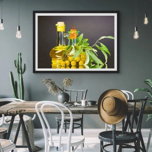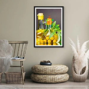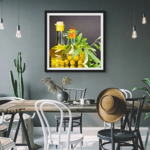 Poster in een zwarte lijst - Stilleven met olijven en olijfolie - 40x40 cm