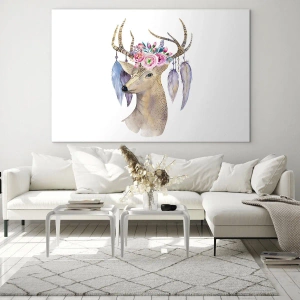 Het glasschilderij "Hert met bloemenkrans en veren" is een artistieke combinatie van natuur en boho-stijl. Het toont een subtiele tekening van een hert versierd met een delicate krans van bloemen en veren, die de compositie lichtheid en elegantie geven. Deze unieke decoratie benadrukt perfect de individualiteit en schoonheid van interieurs.
