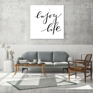 Typografisch schilderij met de inscriptie "Enjoy life" in een minimalistische stijl. De zwarte inscriptie op een witte achtergrond zorgt voor positieve energie en een modern design.