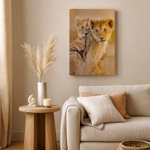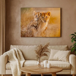 - Dit schilderij toont twee schattige leeuwenwelpjes in hun natuurlijke habitat. Perfect voor interieurs die de schoonheid van wilde dieren en subtiele esthetiek waarderen.