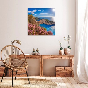 - Een Grieks landschap met een pittoreske klif, turquoise zee en stralende zon, omlijst door delicate bloemen. Het schilderij straalt de harmonie en schoonheid van de natuur uit en past perfect bij mediterraan geïnspireerde interieurs.
