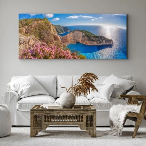 Elk element van het schilderij is met de grootste precisie afgebeeld, wat het karakter van dit werk benadrukt. De intensiteit van de blauwen en turquoise tinten contrasteert perfect met de natuurlijke kleuren van de klif en creëert een harmonieus geheel. Dit schilderij betovert niet alleen met zijn esthetiek, maar brengt ook een sfeer van ontspanning en zomerse lichtheid in het interieur.