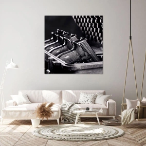 Dankzij het gebruik van hoogwaardige canvasprinttechnologie valt de print op door zijn uitzonderlijke detaildiepte. Elk element van de compositie – van de textuur van de geweren tot het beschermende schuim van de koffer – is nauwkeurig gereproduceerd. De print, gemonteerd op een massief houten frame, is klaar om op te hangen, zonder dat er een extra lijst nodig is. De expressieve vorm voegt karakter en klasse toe aan het interieur.