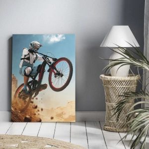 Canvaskunst "Cycling Demon Madness" is een dynamische compositie die een moment van actie en motivatie vastlegt. Het toont een wielrenner op een mountainbike die een spectaculaire sprong maakt, tegen een achtergrond vol pittoreske rotsen en een blauwe lucht, wat een beeld vol energie en beweging creëert.