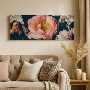 Het canvas wordt over het frame gespannen. De zijkanten en randen zijn bedrukt en zetten het beeld voort. De schilderij is klaar om aan de muur te hangen. Elk product heeft een hanger aan het frame en een montagekit (schroef + pin).