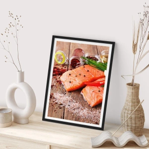 - Deze poster toont verse zalmfilets met kruiden, gerangschikt op een rustieke houten achtergrond. Perfect voor keukens en eetkamers, inclusief een zwarte lijst van 50x70 cm.