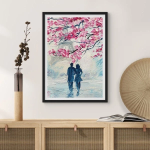 - De poster toont een romantisch stel dat wandelt onder bloeiende takken. Het subtiele pastelkleurenpalet en de artistieke stijl van de afbeelding creëren een unieke sfeer. De zwarte lijst versterkt de elegantie van de afbeelding.