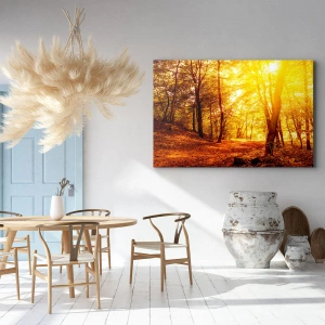 - Een schilderij van een herfstopen plek met een bospad in goudgeel zonlicht. Een sfeervolle en pittoreske compositie die de harmonie en schoonheid van de natuur in het interieur brengt.