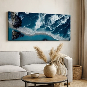 - Een schilderij van oceaangolven die vanuit vogelperspectief tegen de kust beuken. Een dynamisch en harmonieus landschap dat frisheid en rust in interieurs brengt.