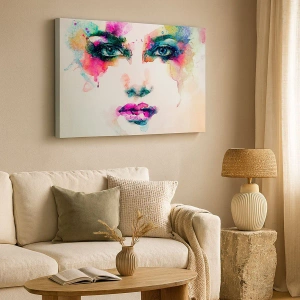 - Een opvallend portret van een vrouw in een abstracte vorm, weergegeven in aquarel. Intense kleuren domineren, wat diepte en een modern karakter aan de compositie toevoegt. Perfect voor de decoratie van een woon- of slaapkamer.