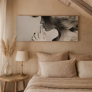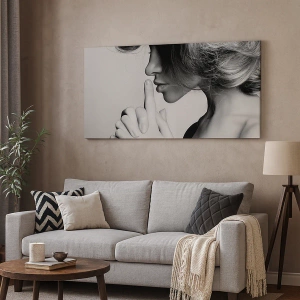 Schilderen op canvas - Zwart-wit profiel van een vrouw die een stiltegebaar maakt - 70x50cm - Luisteren naar zichzelf - Moderne wanddecoratie voor woonkamer en slaapkamer ARTTOR